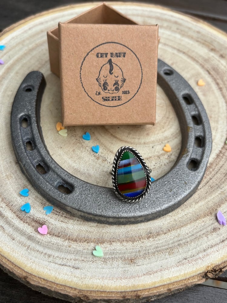 When the surfboard manufacturer resin washes the surf boards, the leftover resin drips off onto the floor. This by product can then be upcycled and re purposed into beautiful jewelry like you see here. It also has a hand stamped ring shank making this piece truly unique.